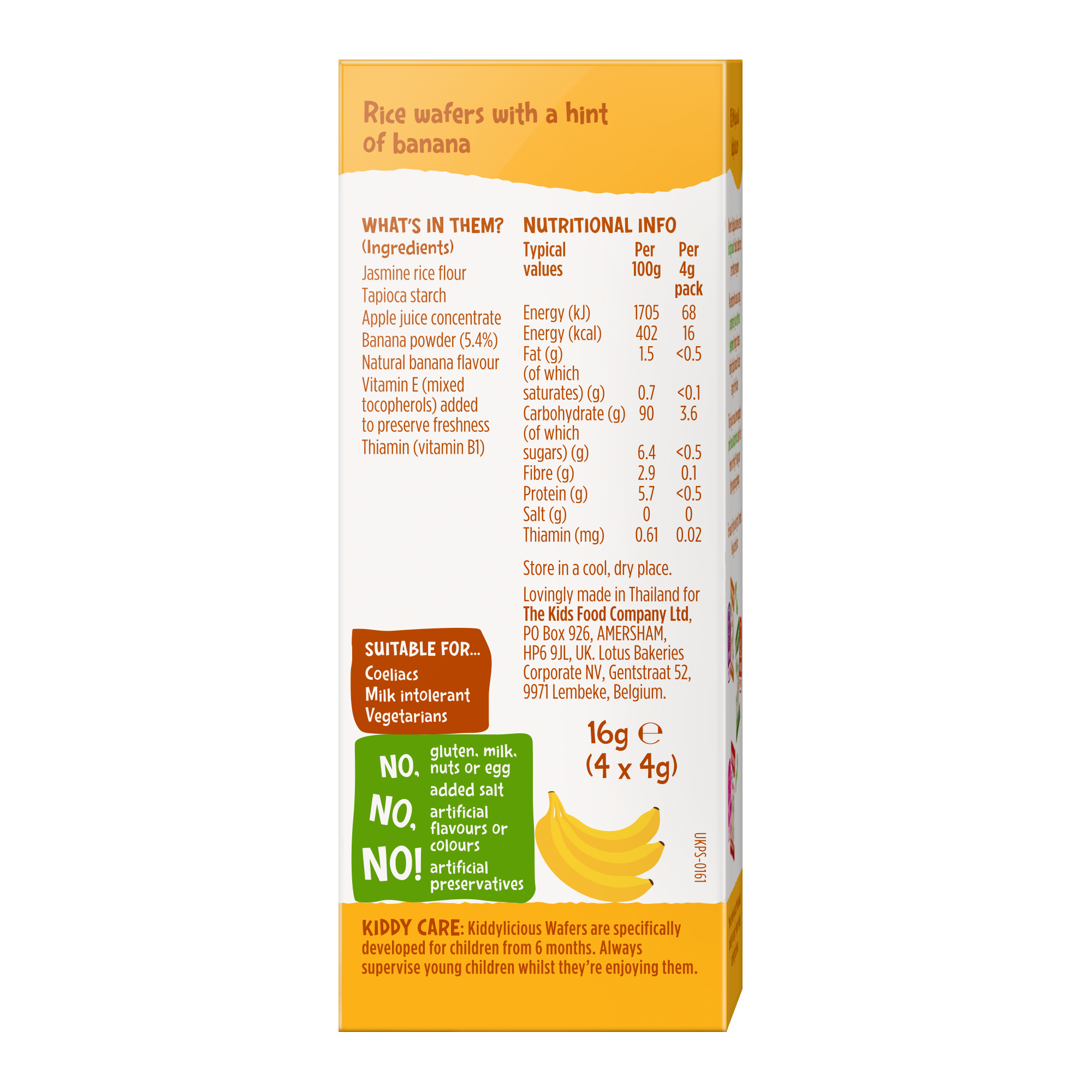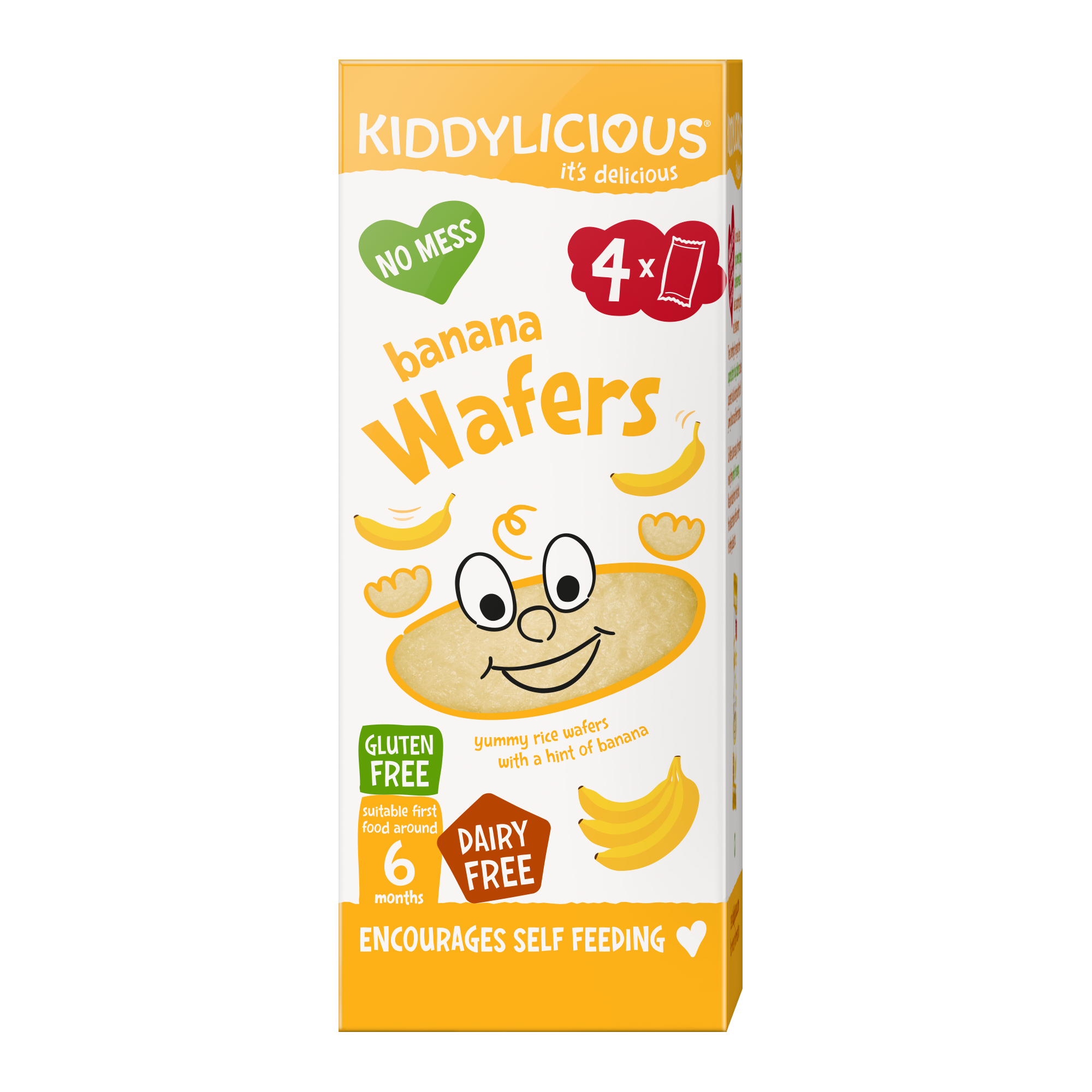 Rýžové oplatky Kiddylicious ochucené pravým ovocem jsou vhodnou první svačinkou do ruky. Mají ideální tvar a velikost do dětské ručičky. Díky hladké textuře nedrobí, ihned se rozpouští v ústech a uleví dásním od bolesti spojené s růstem zoubků. Neobsahují lepek, laktózu, vejce ani žádné umělé konzervanty, barviva či aromata. Oplatky jsou dostupné ve dvou ovocných příchutích – banánové a borůvkové. Jsou vhodné pro děti od šesti měsíců.