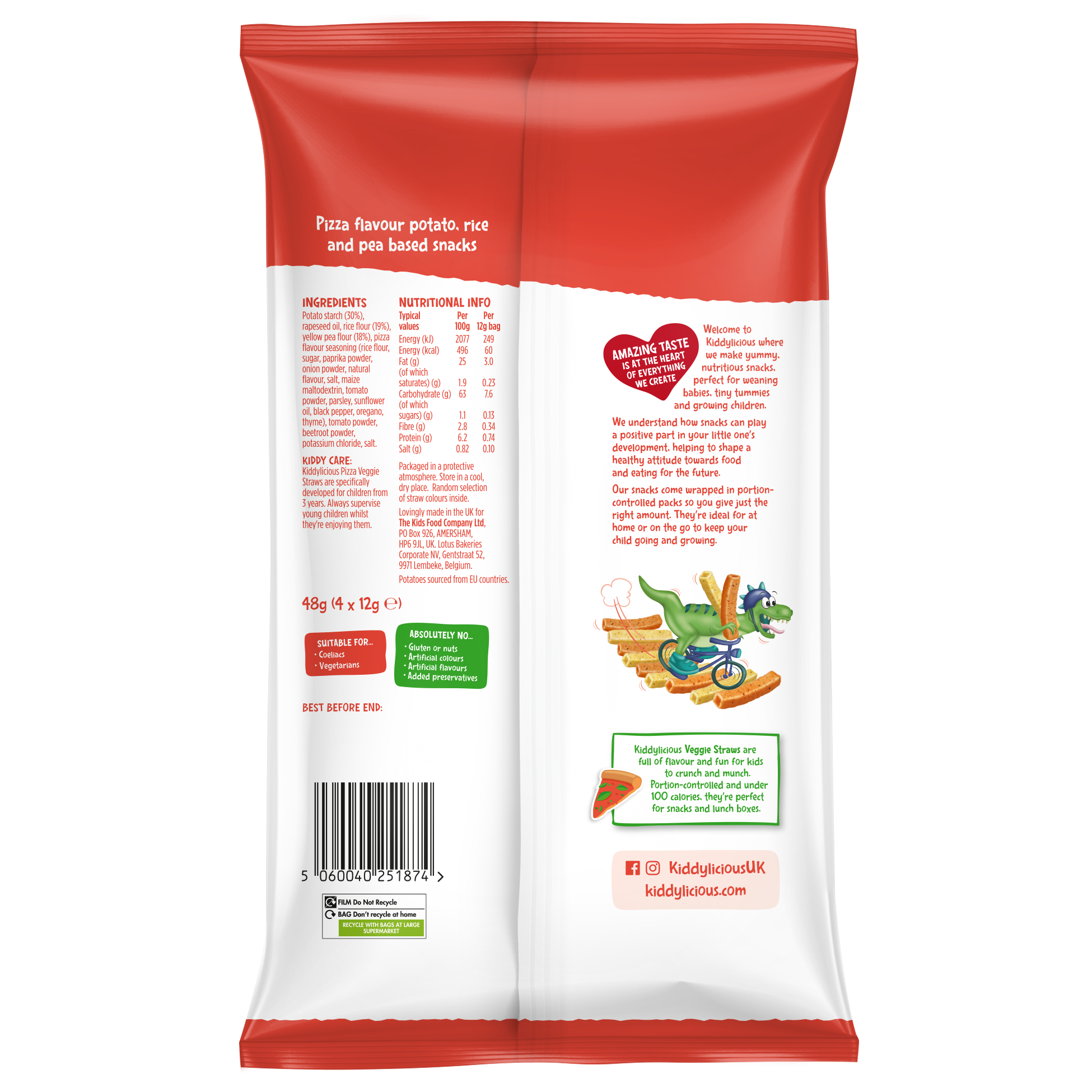 Kiddylicious lahodné zeleninové tyčinky s příchutí pizza ve tvaru dutých brček jsou zábavnou a chutnou svačinkou pro děti od 3 let, mládež i dospělé. Tyto tyčinky s pizza příchutí, jsou dokonalou svačinkou pro kteroukoliv denní dobu a jsou skvělé i na cesty. Jsou bezlepkové, bez mléka a vhodné i pro vegany.